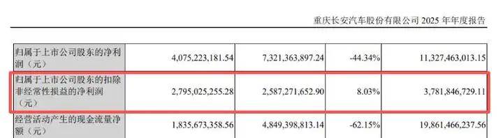 針對歸母凈利潤大幅下滑,長安汽車表示主要受非經常性損益影響。2024年,長安汽車因處置固定資產獲得24.66億元收益,而2025年該項收益僅1.03億元,基數懸殊直接導致賬面利潤出現明顯波動。剔除上述偶發性因素后,長安汽車扣非凈利潤實現8.03%的正向增長,也真實體現出其主營業務盈利能力正穩步修復。