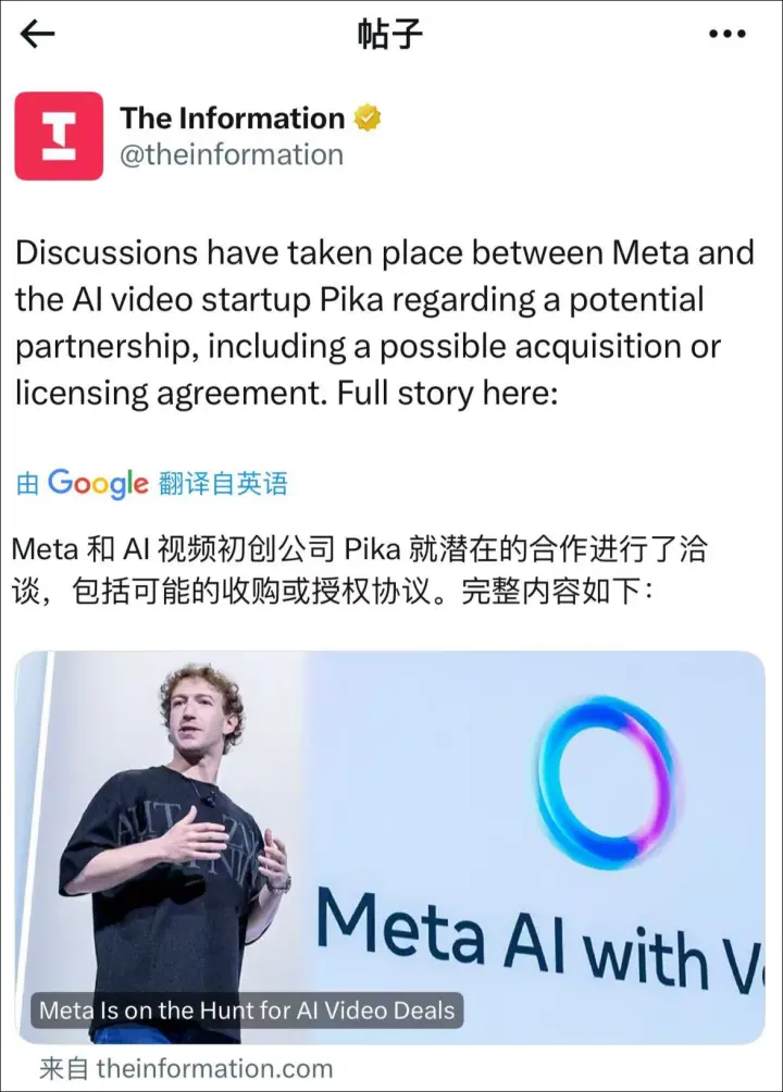 據硅谷權威科技媒體The Information(《信息報》)日前消息,Meta和Pika就潛在合作可能性進行了討論,選項包括直接收購或技術授權。