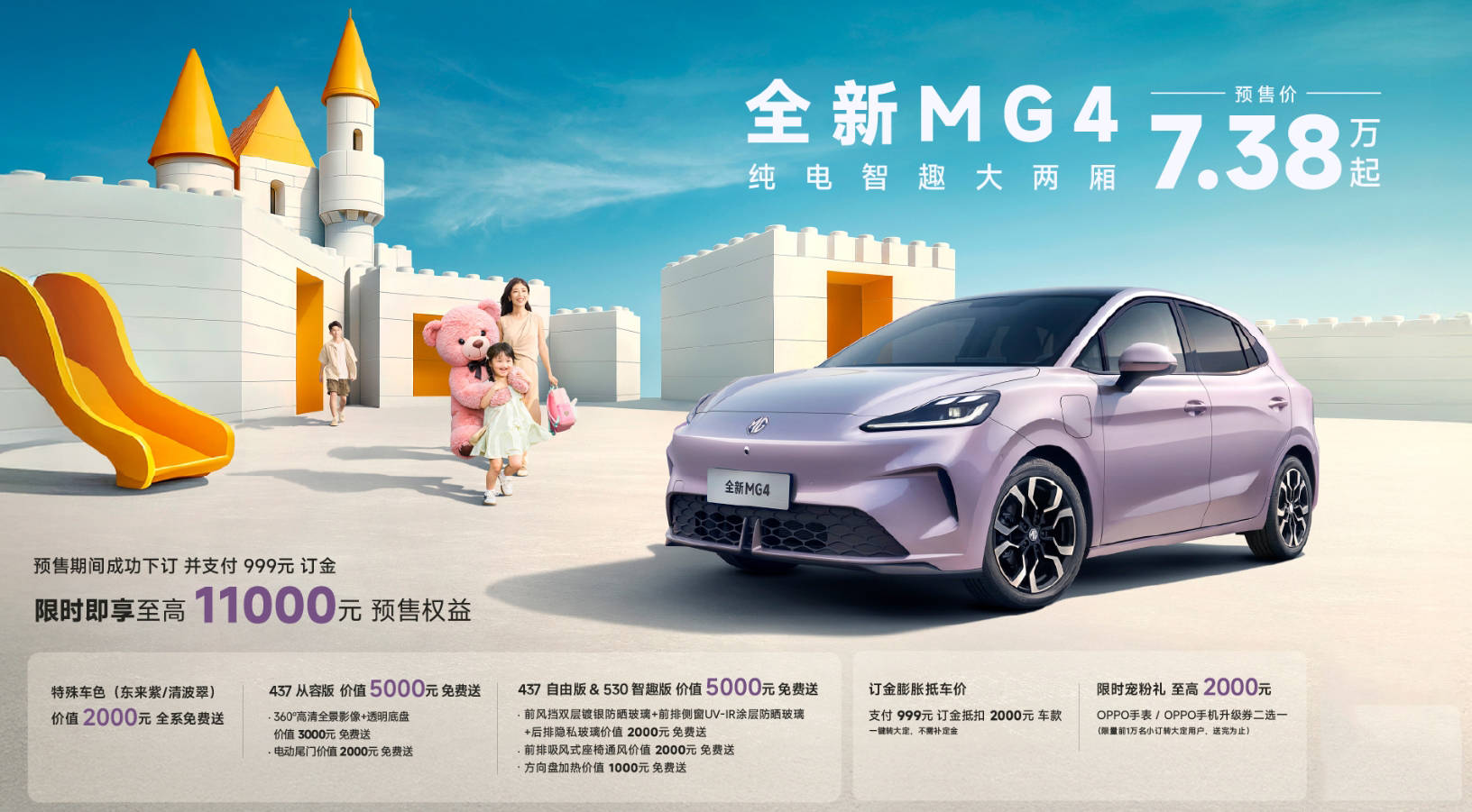 8月5日,全新MG4正式開啟預售,新車共推出4款車型,預售價區間為7.38-10.58萬元。作為MG全面發力新能源領域的重磅車型,新車基于上汽E3純電架構平臺打造,并且全新MG4率先搭載MG×OPPO智行車機互聯系統。與此同時,新車還將推出半固態安芯版本車型,搭載半固態電池,將于9月公布價格,年內批量交付。此外,預售期間成功下訂,并支付999元訂金限時即享至高11000元的預售權益。