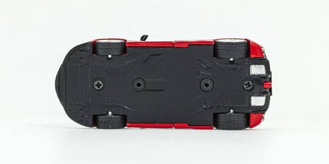 模型的懸掛比較低,輪轂為拉法的原廠銀色輪轂,輪轂中央也有移印的躍馬標,剎車系統也是高度還原的,包括剎車碟和紅色剎車鉗。