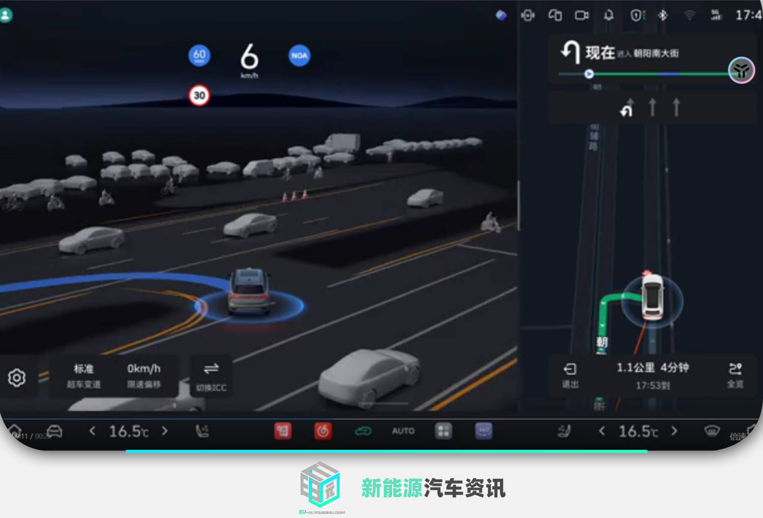 OTA 3.3版本在NOA開啟后,出地庫時可以自動識別閘機桿,抬桿后繼續通行;在三車道路口能夠實現一把掉頭;在路邊臨時停車、在便利店采購時,當車輛處于P擋,只需踩下制動踏板并輕轉方向盤,點擊屏幕【一鍵輔助駕駛】即可激活NOA,車輛可以繼續按照導航行駛。