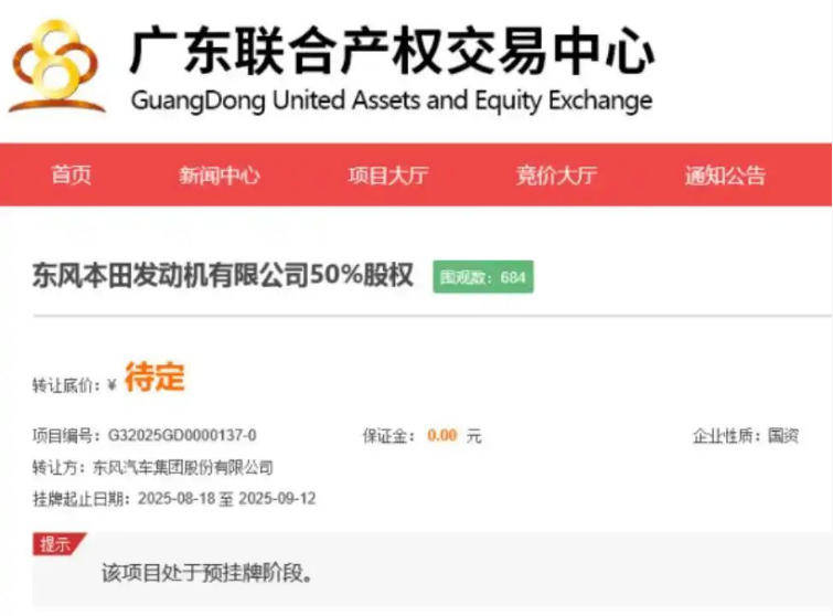近期廣東聯合產權交易中心官網的一則預掛牌信息,揭示了汽車產業轉型大潮中一個標志性事件。東風汽車集團宣布將出售其持有的東風本田發動機有限公司50%股權。