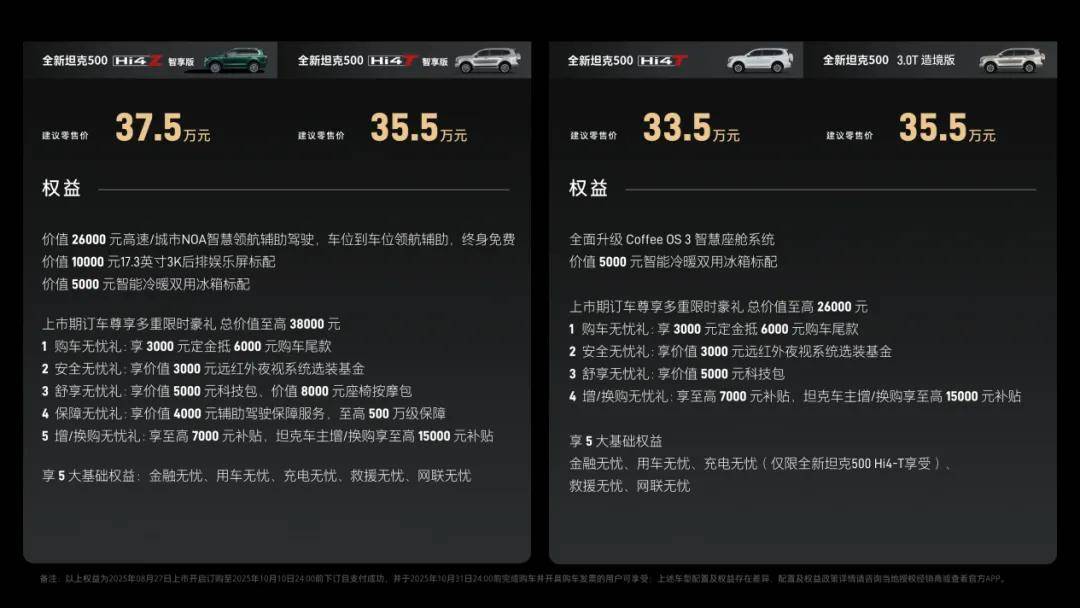 坦克500 Hi4-T定位強越野,搭載2.0T+9HAT,強悍的動力及非解耦四驅結構,能應對更多極限越野場景;坦克500 Hi4-Z定位泛越野,搭載2.0T+前后雙電機,匹配全球最短縱置3擋混動變速箱,WLTC純電續航達到201km,滿足用戶“可城可野”的需求;全新坦克500 3.0T,大排量雙渦輪增壓為專業越野用戶提供純粹硬核動力。